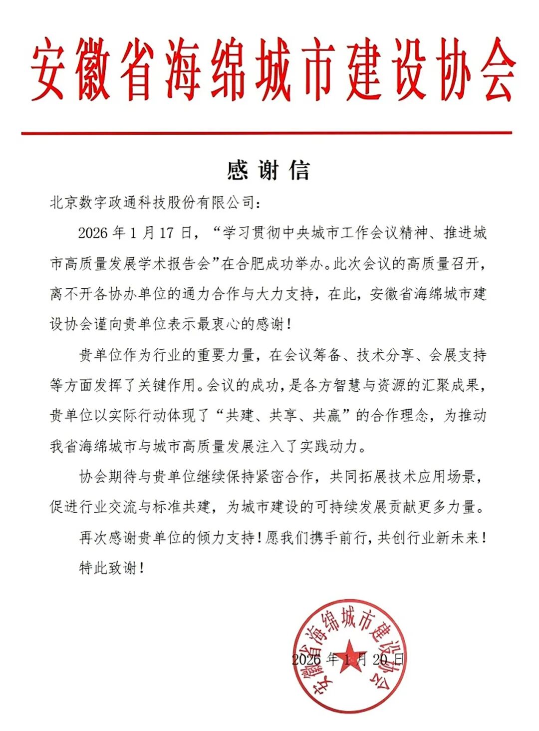 會后,數(shù)字政通收到協(xié)會發(fā)來的感謝信。未來,數(shù)字政通將深化與安徽省海綿城市建設(shè)協(xié)會在城市更新業(yè)務(wù)領(lǐng)域合作,不斷創(chuàng)新技術(shù)、優(yōu)化服務(wù)、拓展場景,在國家推動城市高質(zhì)量發(fā)展與治理現(xiàn)代化的戰(zhàn)略指引下,肩負起全面打造宜居、韌性、智慧城市的責任,助力城市高質(zhì)量發(fā)展。